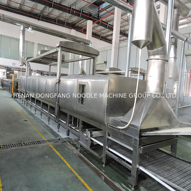 Depois que os macarronetes saem da caixa cozinhando, estão pulverizados para fazer os macarronetes absorver a água e amaciar, e entrar então na máquina de corte para ajustar o comprimento e para eliminá-lo. A tira cortada cai na caixa após o sopro e dar forma e desliza finalmente na máquina de secagem através do painel deslizante.